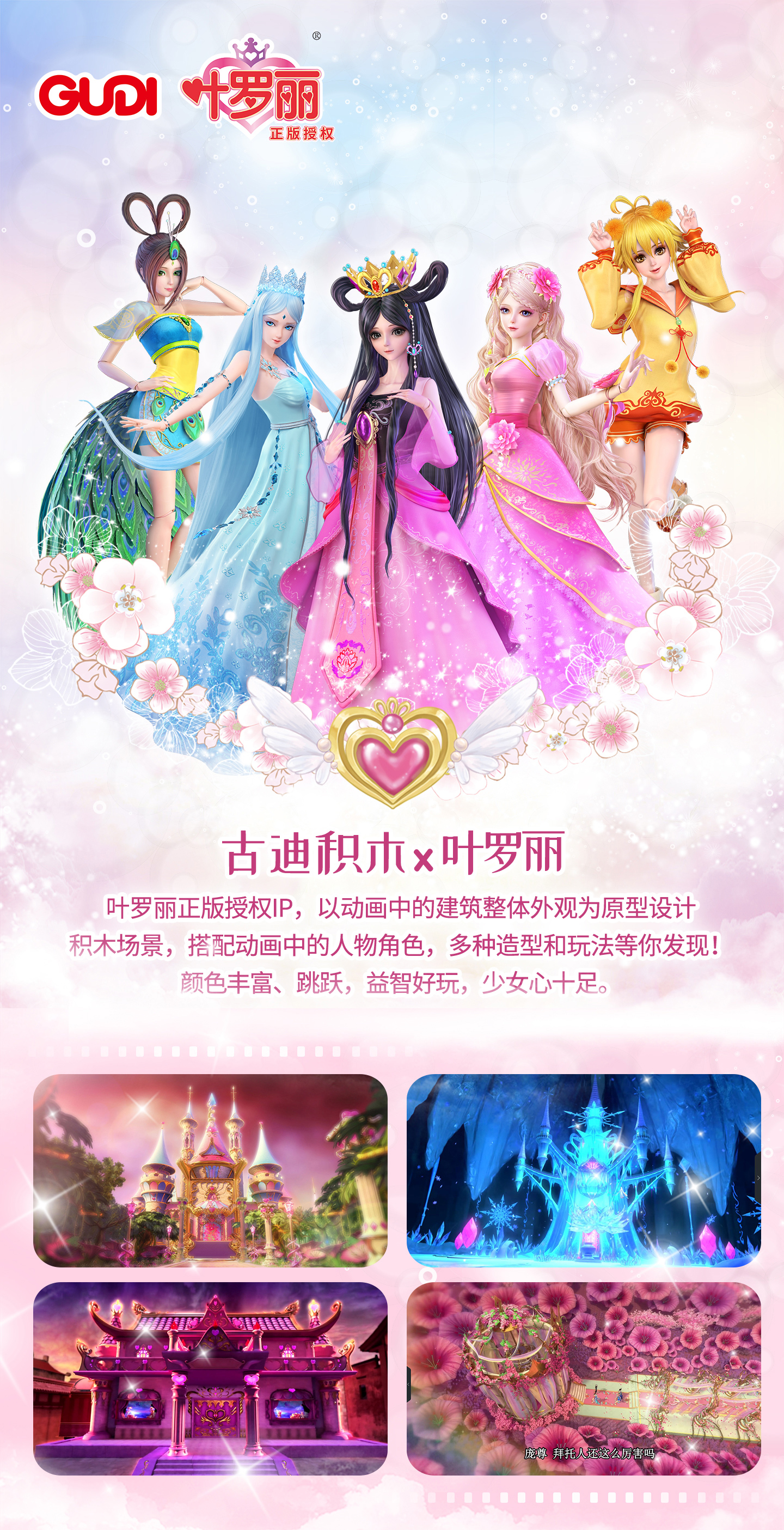 古迪積木葉羅麗系列,第一彈共推出了5個系列,分別是人氣角色辛靈的葉羅麗娃娃店,羅麗與她的城堡,孔雀的房子,還有冰冷高貴的冰公主與她的宮殿,和靈公主的花圣殿,為進一步滿足消費者需求、拉近消費者與品牌距離,古迪積木將原作中的羅麗、辛靈、冰公主、孔雀等人物形象融入產(chǎn)品設計,附能仙宮魔堡,讓積木場景更具有內(nèi)涵與故事情節(jié),引領、個性化、多元化的積木品牌新風潮。