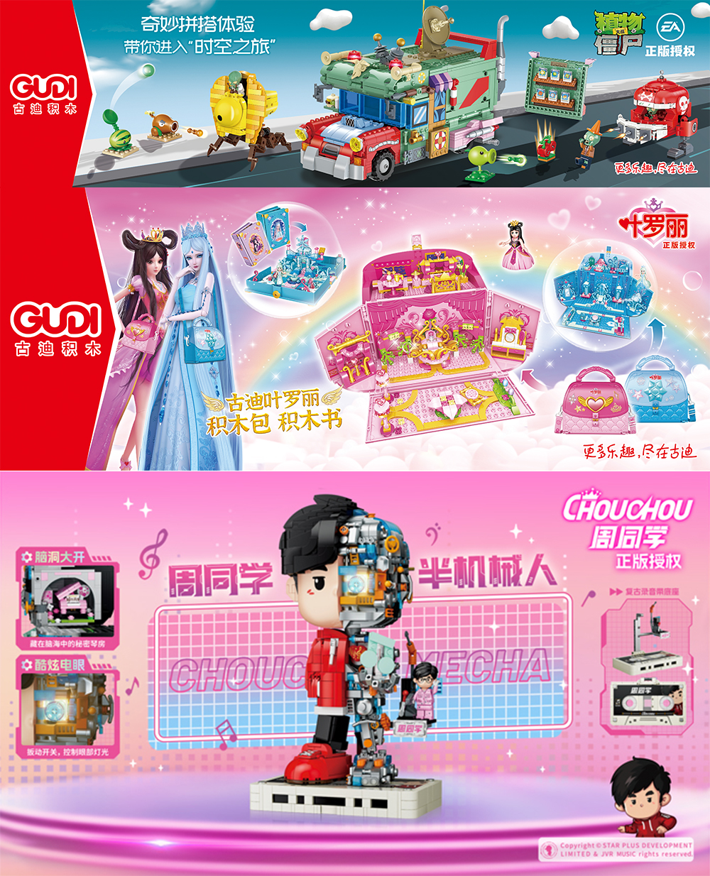 古迪積木是新樂(lè)新科教文化旗下積木品牌。作為中國(guó)積木原創(chuàng)品牌,古迪積木在十余年來(lái)一直以來(lái)致力于研發(fā)、設(shè)計(jì)、生產(chǎn)、銷(xiāo)售高品質(zhì)的積木產(chǎn)品。而在近幾年來(lái),古迪積木更是積極開(kāi)啟跨界合作,攜手大牌IP,不斷為品牌賦能。截至目前已經(jīng)與經(jīng)典游戲IP——植物大戰(zhàn)僵尸;國(guó)內(nèi)知名女孩動(dòng)畫(huà)IP——精靈夢(mèng)葉羅麗;周杰倫正版二次元形象——周同學(xué)等多個(gè)知名IP聯(lián)名打造多款積木玩具,持續(xù)為玩具市場(chǎng)和消費(fèi)者帶來(lái)創(chuàng)意十足的積木產(chǎn)品,解鎖IP多樣玩法,讓玩具可玩性與實(shí)用性?xún)r(jià)值并存,進(jìn)一步鞏固了古迪積木在積木市場(chǎng)的領(lǐng)先地位。