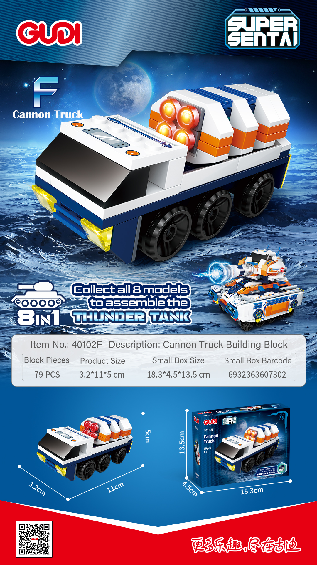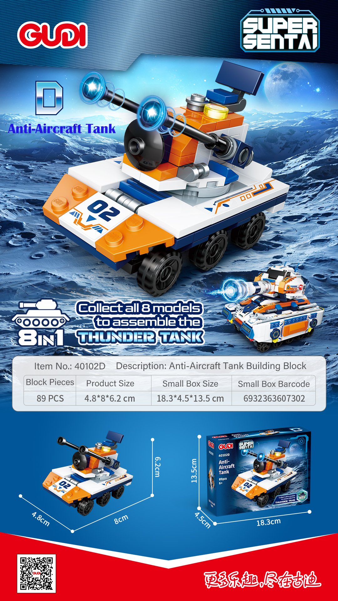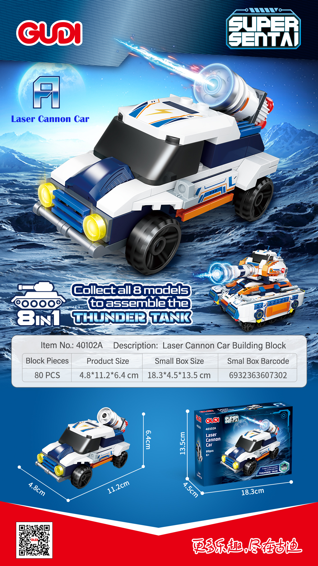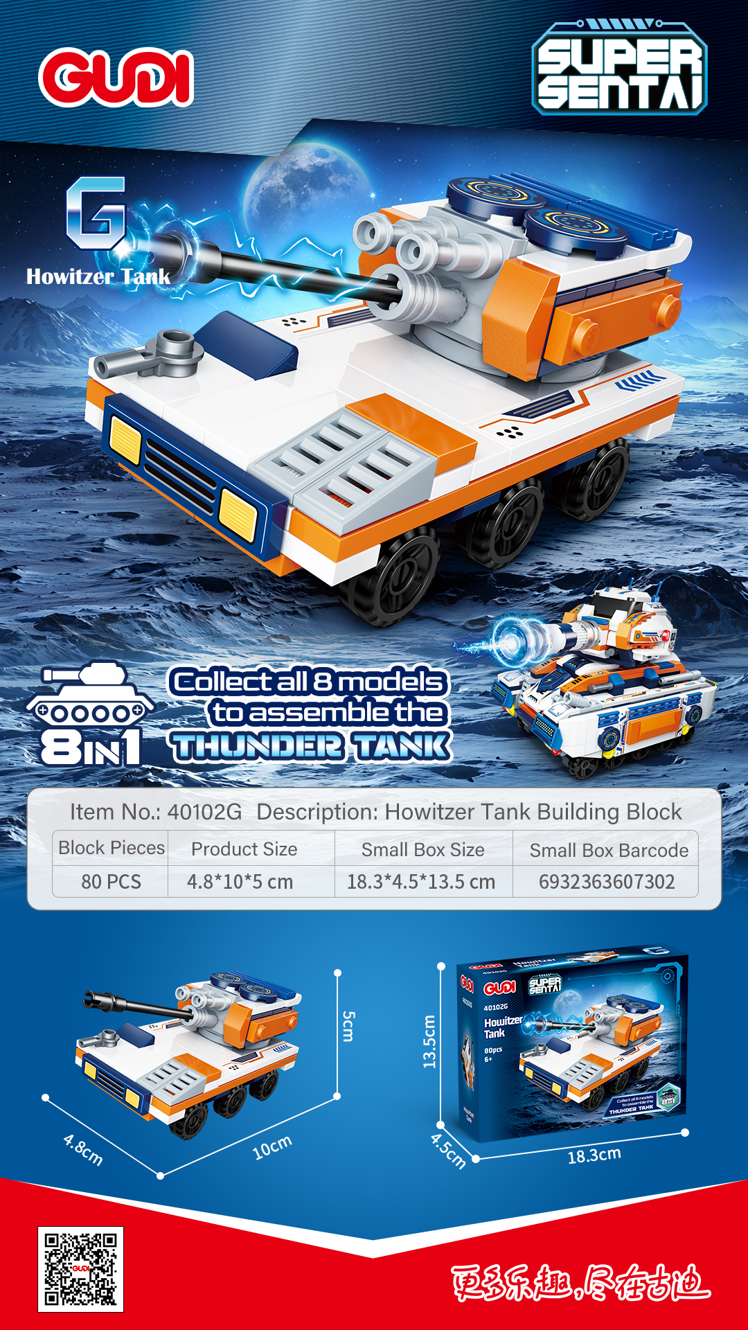 - Description:40102A-Laser cannon Car-80PCS; 40102B-Artillery Tank-79PCS; 40102C-Missile Armored Vehicle-72PCS; 40102D-Anti-aircrafe Tank-89PCS; 40102E-Light Tank-82PCS; 40102F-Cannon Truck-79PCS; 40102G-Howitzer Tank-80PCS; 40102H-Rocket Launcher Buggy-73PCS;