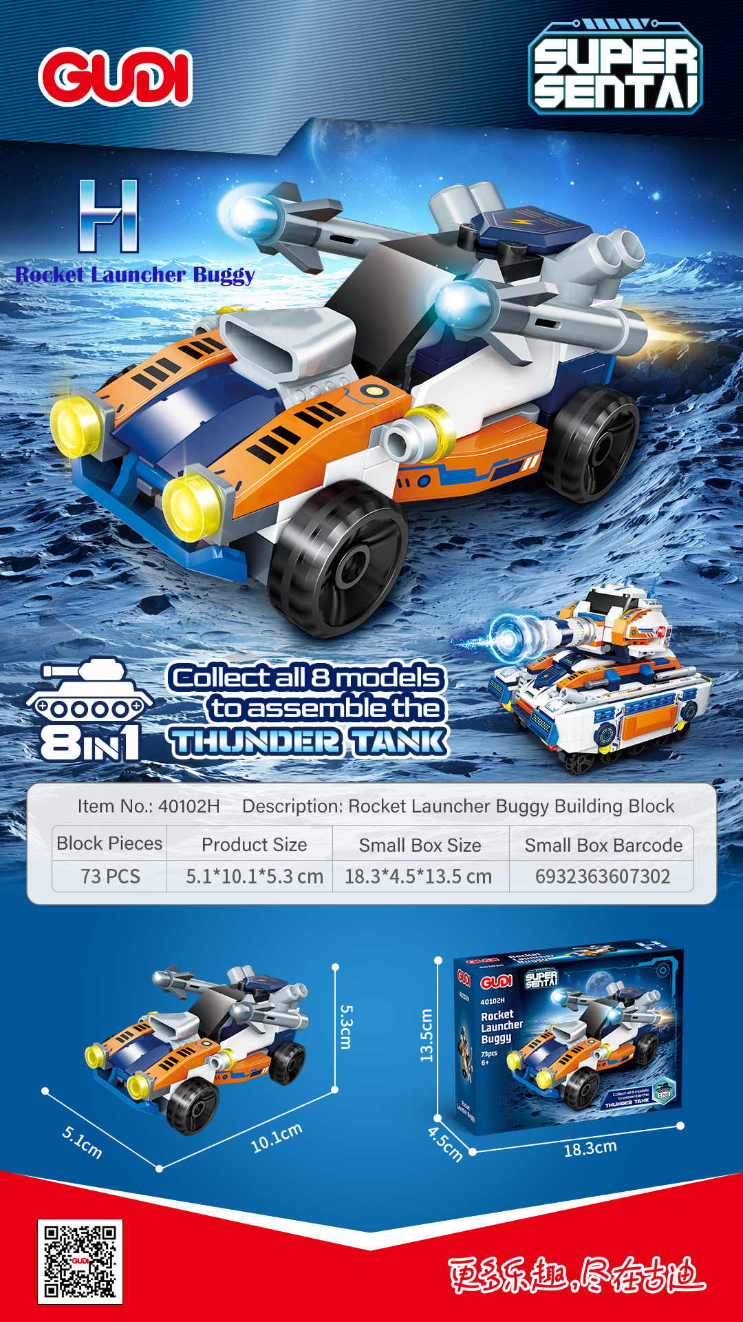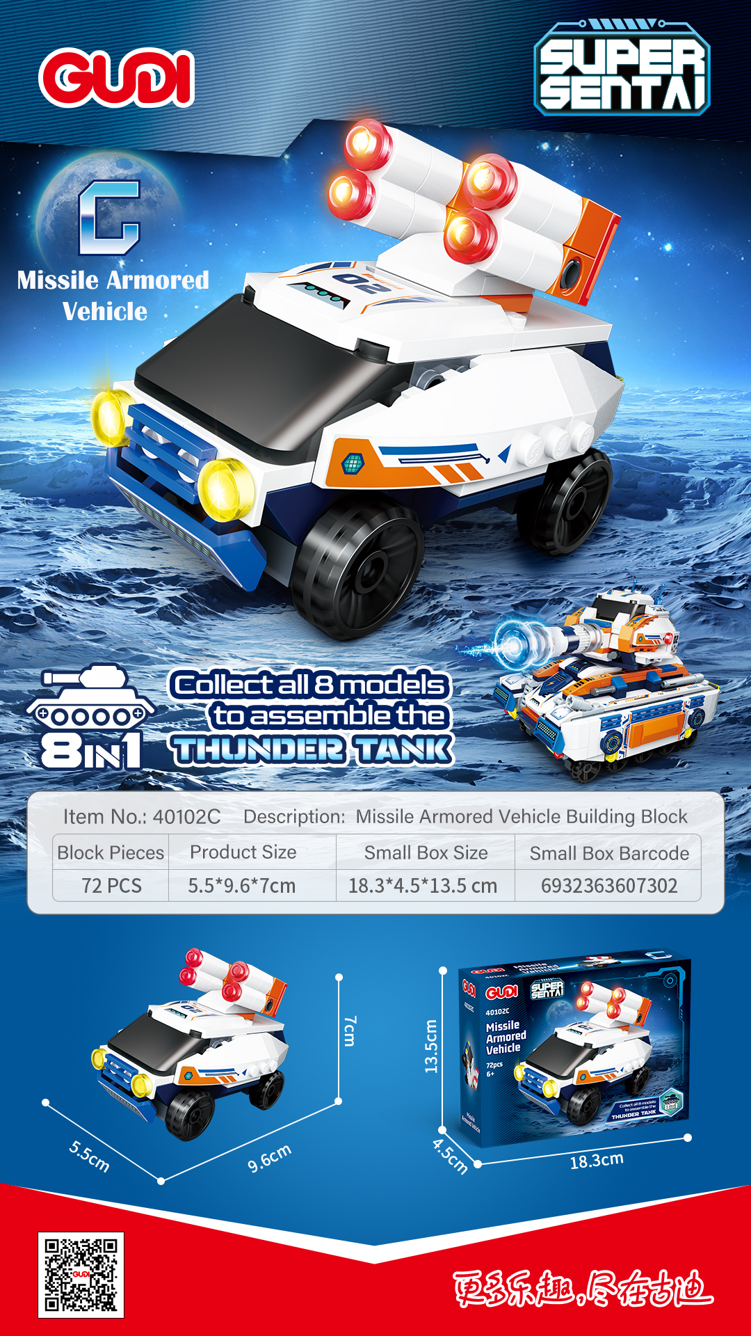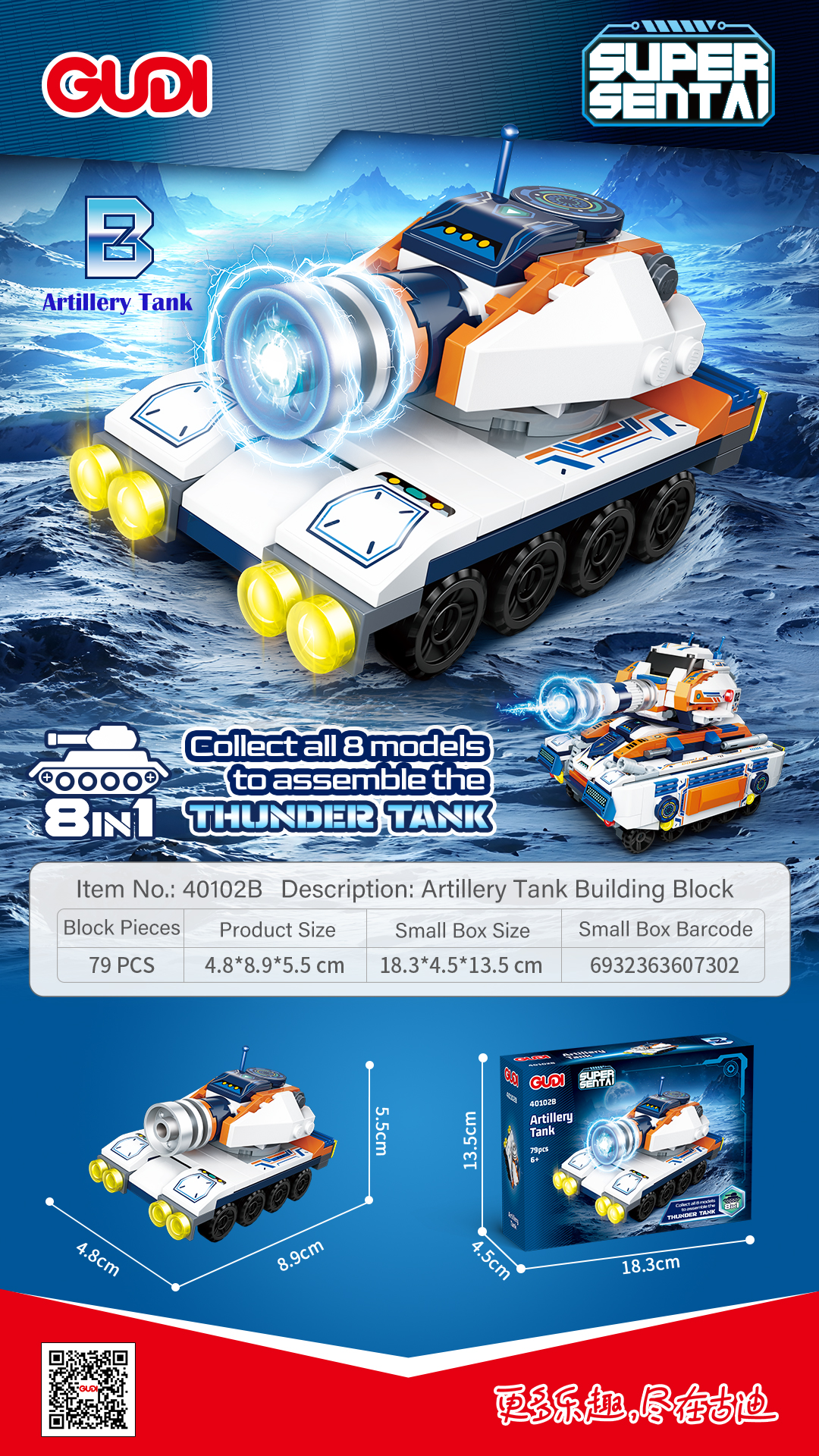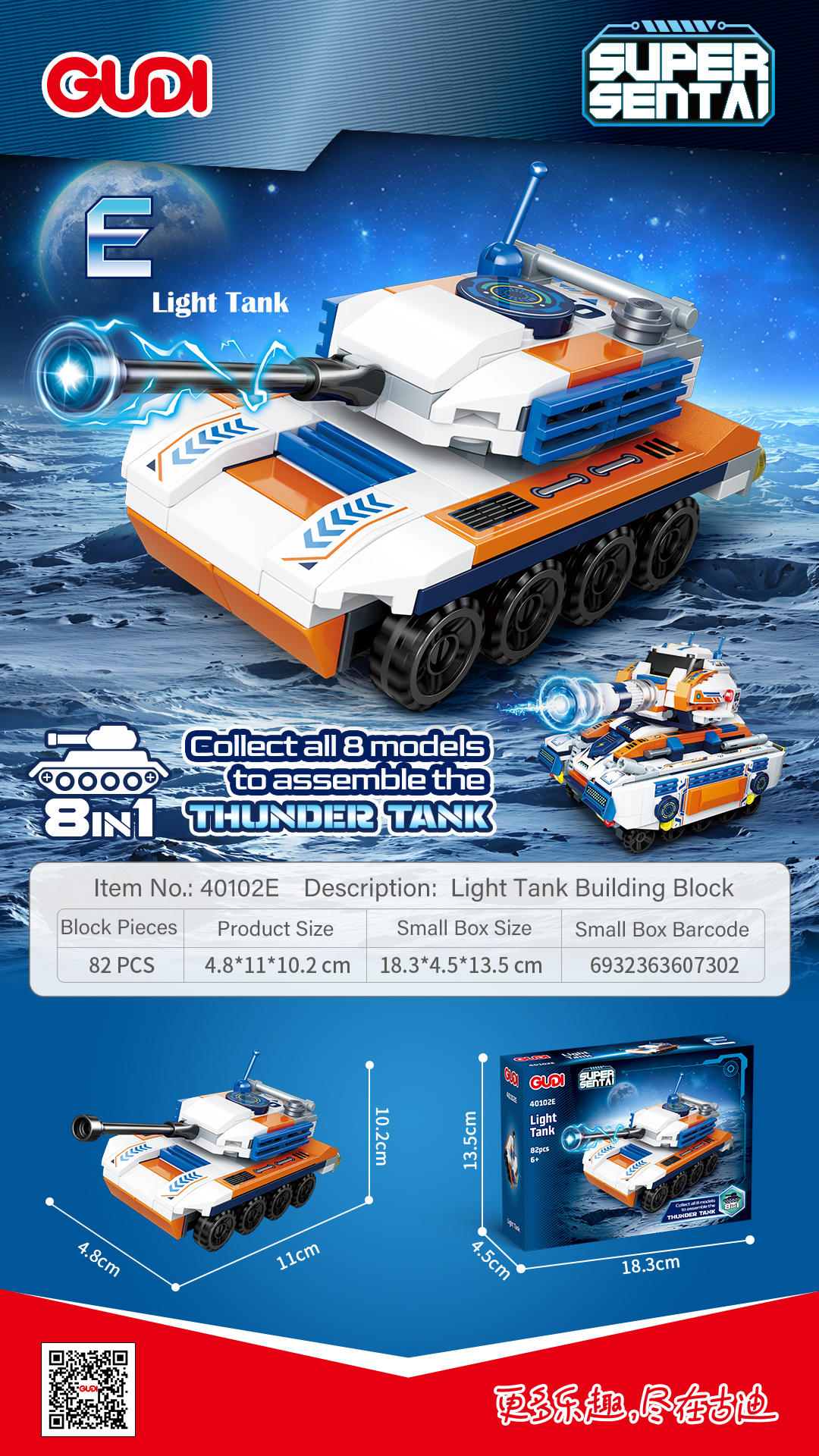 - Description:40102A-Laser cannon Car-80PCS; 40102B-Artillery Tank-79PCS; 40102C-Missile Armored Vehicle-72PCS; 40102D-Anti-aircrafe Tank-89PCS; 40102E-Light Tank-82PCS; 40102F-Cannon Truck-79PCS; 40102G-Howitzer Tank-80PCS; 40102H-Rocket Launcher Buggy-73PCS;