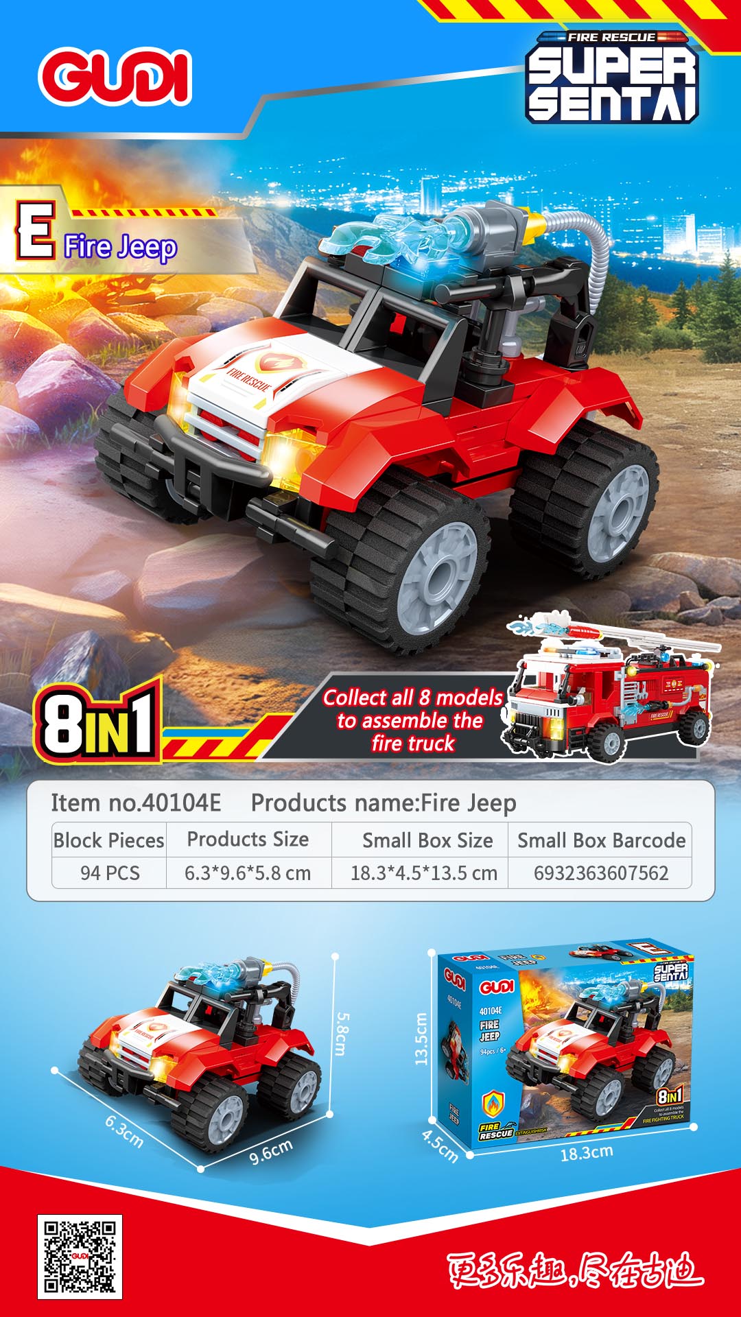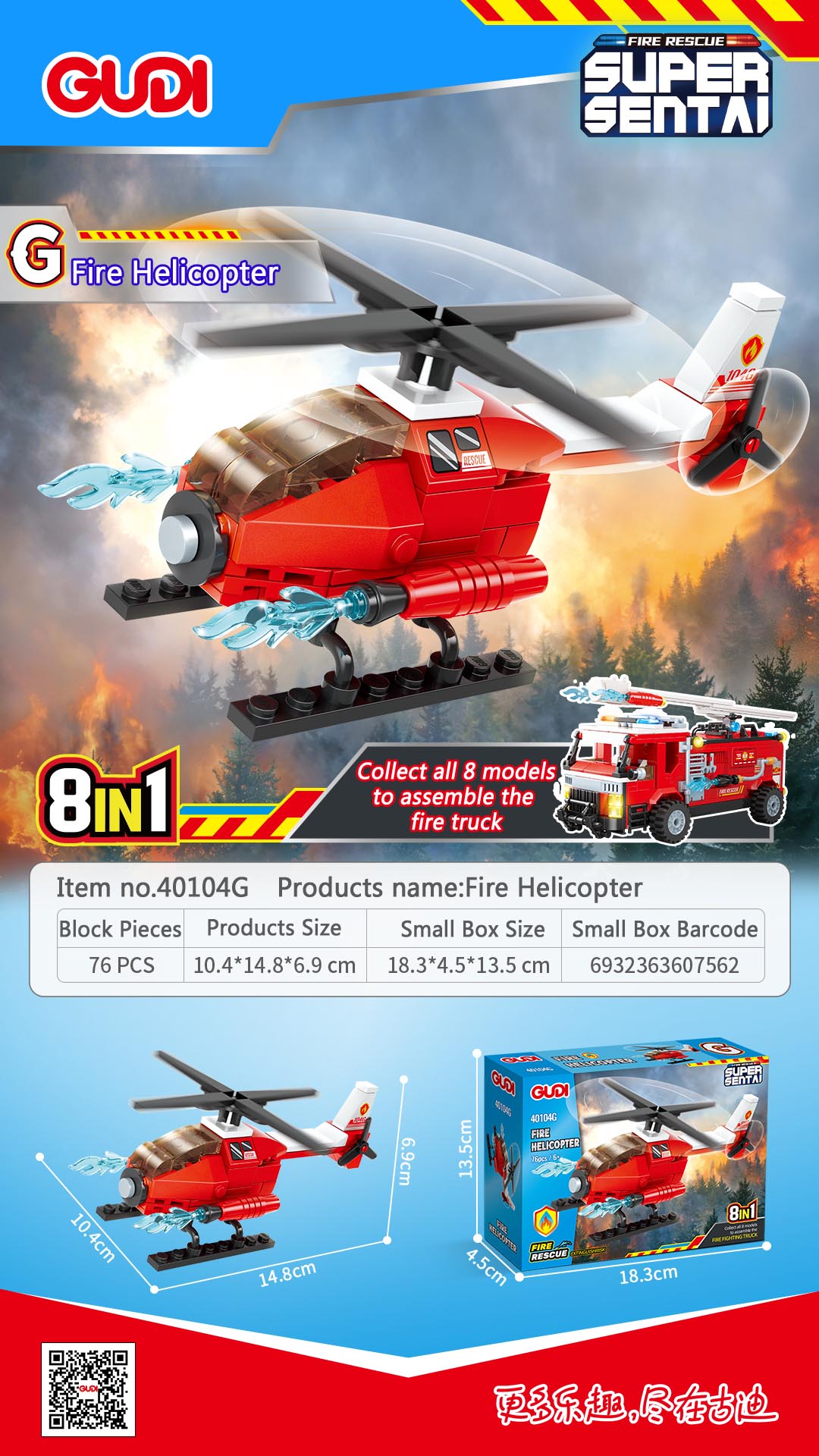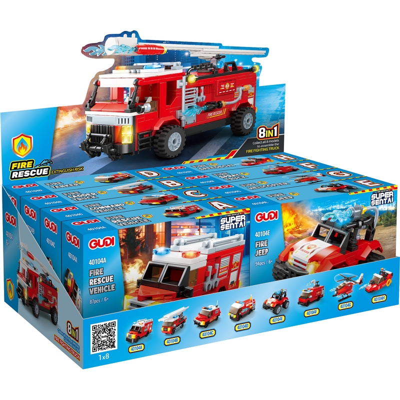 - Description:40104A-Fire Rescue Vehicle -87PCS; 40104B-Fire Ladder Truck -81PCS; 40104C-Fire Communication Vecle -86PCS; 40104D-Fire Tanker Truck-84PCS; 40104E-Fire Jeep-94PCS; 40104F-Fire Spray Truck-83PCS; 40104G-Fire Helicopter-76PCS; 40104H-Fire Speedboat-77PCS